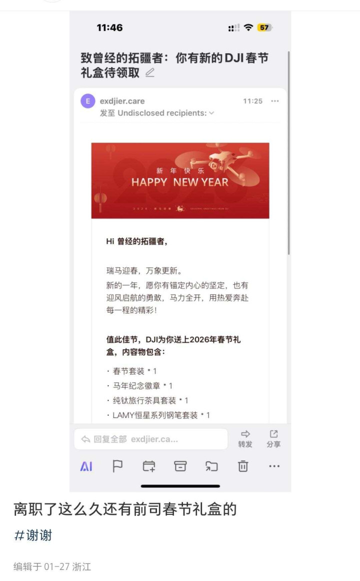 “离职了这么久还有(收到)前司春节礼盒,谢谢!”一位网友在小红书平台晒出的大疆官方邮件显示,邮件标题为“致曾经的拓疆者:你有新的DJI春节礼盒待领取”,内文写道:“瑞马迎春,万象更新。新的一年,愿你有锚定内心的坚定,也有迎风启航的勇敢,马力全开,用热爱奔赴每一程的精彩!”